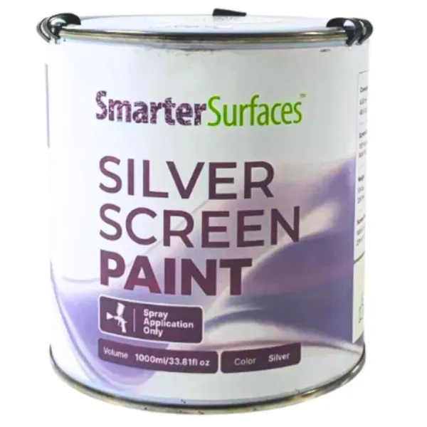 Smarter Surfaces Silver Screen Paint has a high gain of 1.90 at 90°, delivering bright, clear projections. It supports wide viewing angles up to 140° and works best with projectors of at least 3,000 lumens in low to medium ambient light.